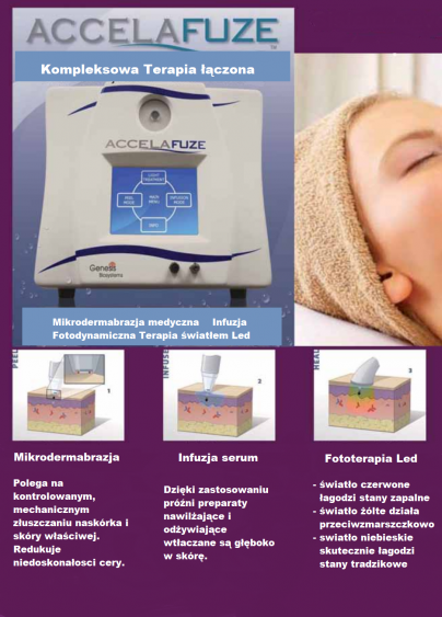 Rewolucyjny system odmładzania skóry, jedyny w swoim rodzaju łączący trzy terapie w jednym zabiegu. Wyprodukowany w USA, innowatorski. Accelafuze zapewnia zmniejszenie objawów starzenia się skóry. Łączy w sobie sprawdzone zalety mikrodermabrazji korundowej z odmładzającym działaniem roztworów do infuzji oraz terapię światłem LED. Naukowo udowodniono efektywność zabiegów, które pobudzają w organiźmie własny system naprawczy do produkcji nowych komórek oraz włókien kolagenowych i elastynowych, co zmniejsza objawy starzenia się skóry.